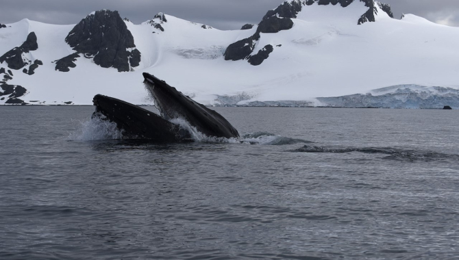 Then – suddenly – things change. Just as dinner has started, we are called outside for whales. And not only to look, but also because this is the perfect chance for our guide and marine biologist Benji. With a crossbow and a modified arrow, he hopes to shoot whales and collect samples of their skin and fat. Through the skin he can find their DNA and define to which family the whale belongs, through their fat he can research their feeding habits, but also see how much of our polution like ddt, pbc, heavy metals and hormones they store in their body. Luckily Grey is on the hip and easily launched – in no time the team of driver Jarran, assistent Emma, photographer Sarah and Benji himself are in the zodiac. They follow the whales for quite a while; it is a female bowhead with her young. Since she is with here young, feeding close to the surface, she will not dive deep – which means that she only very rarely will show her fluke. And exactly the first thing they have to do is taking a photograph of the fluke, the fingerprint of the bowhead whale. By the time they are ready to shoot the whales surface less frequently – but in the end an excited Benjamin manages to get a sample. Everything could be clearly observed from the ship – the whole process has been followed closely. To see a zodiac with four people so close to the whales gives a different understanding of their actual size. Back on board they get an applause – even though this action means that we are too late to do our planned evening landing now. Here in Antarctica sites are closed between 22:00 and 04:00 – to give the wildlife a resting period. We still drop anchor close to Half Moon Island. Drinks, talks and the experiences of the day are enjoyed on deck. Later tonight we will heave anchor and start sailing towards Deception Island. But for now no one wants to be anywhere else then here; on board Bark Europa, on a calm and intensely beautiful evening in the Antarctic, one of those evenings it is simply impossible to go to sleep.