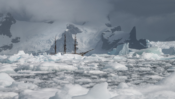 A full coverage of a mixture of glacier-ice and sea-ice makes for a thrilling and scenic cruise, slowly manoeuvring and pushing around the floes that surround nicely carved icebergs.