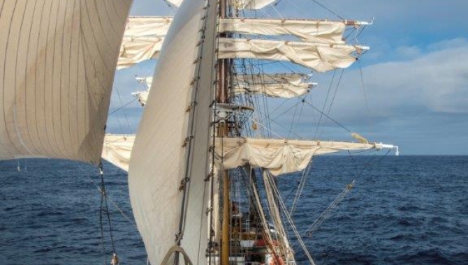 The good winds that were with us yesterday died down last night. Before sunrise it was already blowing with less than 10kts from the SSW, becoming afterwards light airs just allowing a steering way and at daybreak Europa meets calm windless conditions. After a couple of drifting hours, voyage crew is called on deck to give a hand. All Square sails were clued up, the remaining Staysails were set and Starboard engine roars for a while, helping the motor-sailing at a speed just about 4kn, on 6kn of N by E breeze. Next sailhandling movement was to gybe the Staysails to Port tack while for a brief period the sun shines on the overcast skies, although we are under the influence of a High Pressure System overtaking us.
