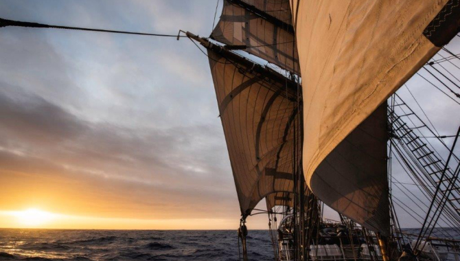 Dawn offered a short glimpse of the rising sun over the horizon, to quickly disappear behind the clouds that will cover the sky duringtoday’s journey, leaving behind a rainy day. After the strong blows experienced last night, in the early morning the wind decreased to a light W-ly breeze. By then, and with the help of many, we brace from close-hauled to bean reach and set the Outer Jib, Middle Staysails, Top Gallants. Not much later the Royals join the sail configuration. With the light breeze we roll over the long swell at just about 3.5kn. But the situation didn’t last very long, as soon gradually the wind increase. Following it as it rises and veer towards becoming N-ly, we steer on a course that will bring us to our first destination in Antarctica. By the afternoon the wind had increased to 23kn, blowing from the NNW as we sail on a 165º course at 7 to 7.5kn, with all Squares set, Lower Staisail, Spanker and all the head rig on a point of sail close to Beam Reach. Continuing with the preparations for our first landfalls in Antarctica, we also had to attend the mandatory briefing of the “International Association of Antarctic Tour Operators (IAATO)”. This membership association set up the rules and code of conduct for visitors ashore, to do safe and environmentally friendly touristic operations in Antarctica, in the frame of the Antarctic Treaty agreements. After all attending to this talk, we are ready for our first visit ashore. With our current speed under sail of about 7kn, and covering the last few miles left of the Drake Passage, it looks like tomorrow we will arrive to the South Shetland Islands, gate to the Antarctic continent. After the last few days braving the rough waters and seas of the Drake Passage, now at last Antarctica is at our reach. It might have seen difficult to reach, but we just have to bring back to our minds that Antarctica has been officially the last frontier in the planet to be revealed and studied. So never has been an easy job to get to it. In the past many perished or suffered great struggles to prove the existence of a south-polar continent, that was already predicted thousands of years ago by Greek philosophers in the 4th century B.C. For us, those legendary lands would represent the first land we see and hopefully where we will set foot after sailing the Drake Passage,following the path started by those early explorers and sealers. With the difference of enjoying the commodities of a ship equipped with the latest navigational systems, central heating, nice bunks, excellent food and possibilities of downloading wind forecast and ice charts, all aids to plan a safe sailing, the itinerary and landfalls. Like this, late at night we already plan to sail between Nelson and Robert Islands, though the so called Nelson Strait, that will open the relatively sheltered SE shores of the South Shetlands for us to visit.Still laying at a distance of about 70nm by our daily meeting after dinner, sure by the early morning we will all catch sight of its rockycoasts.