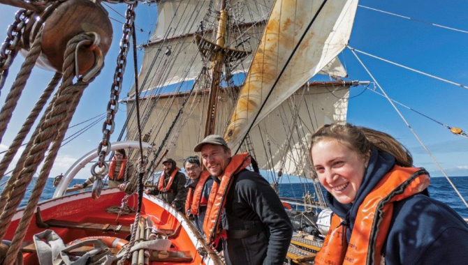 With increasing winds, slowly picking up to 15-18kn from the SW and WSW, in the early morning was time to start setting more canvas. Gradually more sails are sheeted down and hoisted, and by dawn, while the sun comes up over the horizon in yet another amazing sunrise, the Europa happily sails again at 6 to 7kn, in the good weather and wind conditions with all her squares set, plus Lower and Middle Staysails, all head rig and the Spanker. As the morning hours pass by, several squalls clearly show up in the radar, crossing paths with us and carrying wind and rain in short blasts, but enough to make us take some precautions and clue up the Royals. The sunny afternoon allowed us to swing out the Sloopy, that has been resting on deck, making for difficult setting of the Main Course tacks. With her secured alongside there is more space available to fiddle around with sails allowing better sail setting. Afterwards, fair winds from the WSW blowing about 23 to 25kn, made for setting the Royals once more, and having the ship sailing with all her canvas but Upper Staysails and Gaff Top Sail. Like this our speed increase to 8-9kn keeping a good steering course of 20º. As the evening comes, the sunny weather gets masked by some meteorological instability, with more squalls sweeping over the ocean, that could be seen at the distance as dark clouds clinging from the sky. In prevision of the associated wind increase and also having in mind the stronger winds expected during the night, the Royals are furled again, reducing canvas with the last light of the day before dinner.Day like today make for all to wake up, enjoy the good weather and sailing conditions, join the watches, bring cameras on deck, and at the same time also increase the affluence to the different talks offered by the crew and guides. Today, as we left already behind the cold Antarctic waters and now we sail in the Southern temperate areas of the South Atlantic, Sarah and Jordi wanted to wrap-up all the information about the Polar Regions.Behind us lay the colder latitudes of the 60’s and the 50’s and we now find ourselves on what are called since the early times os sailing “the roaring forties” where strong W-ly winds prevail. So far today we had a mild journey on fair breeze and good seas, but is forecasted a change in the next hours. Looks like we will have back some of the hard sailing experiences we passed further South, though now under more benign temperatures. Thinking back on our time passed in Antarctica and South Georgia Jordi did a second talk about Polar Ecosystems, now getting into more detail on the wildlife inhabiting those extreme environments and their adaptations to endure life close to the Poles. Many pictures were shown as well taken from his travels on sailing ships up North and in the Antarctic region, as a comparison of the diversity on both areas. On the other hand, Sarah is been living for years now in Spitsbergen, and she offered an overview of how is to live there and see theextraordinarily different seasons passing by, with their long and cold winters, relatively short summers and even shorter spring and autumn. Also today, Janke gathered all who wanted for a lecture as acontinuation of the sail training and navigation program. Our Captain explained the different Points of sail depending where we want to steer the ship in the different winds, and about the sail configuration in any case. Different wind directions and strength combined with the swell characteristics, make for setting different amount of canvas. While we were enjoying the sun on deck, taking pictures or on duty at the wheel and lookouts, a quick look at the sea offered a variety of new and exciting bird species to keep adding to our already long list. Numerous of the Inaccessible Island (from the Tristan archipelago) endemic Spectacled petrels could be seen following the ship. They are close relatives from the more common White chinned. The latter with breeding grounds all along the subantarctic islands and still spotted here and there almost every day we spend at sea. Spectacled are great travelers, when leaving the nesting colonies they disperse all over the southern hemisphere oceans, but mostly following the Brazilian and Benguela currents along the South American and African coasts. Another of the Tristan da Cunha endemic birds seen today is the beautiful Atlantic petrel, with their dark brown upper parts including the head and upper breast. Also under the tail but showing a light belly. After raising their chicks in the islands, they also disperse over the south Atlantic including further north to subtropical areas. And including another bird that almost could be considered another endemism, Great shearwaters keep flying around all day. They are one of the great world’s ocean wanderers, that can be found all the way in the North Atlantic including latitudes around Southern Greenland, but their breeding grounds are restricted to Tristan da Cunha group with a small population nesting at Falklands. Sharing the seas with those larger species, also some of the small but brave storm petrels keep fluttering their wings over the ocean swells, hundreds of miles away from land. Two more different species were spotted today: White bellied and White faced storm petrels. The first one is similar to the Wilson and Black bellied but showing a completely white underpart, between the black head an neck and the under part of the tail. Less common than other similar storm petrels, their nesting areas reduced to a handful of the smallest Sub Antarctic Islands along the Polar Front, also Tristan and Gough group, and the remote Eastern and Juan Fernandez Islands along the chilean coast. The distinctive White faced storm petrel are slender and elegant, withnoticeably long legs and large rounded wings. Black long patches covering the eyes and white face and forehead A bit more cosmopolitan than other of their relatives storm petrels, white faced are n