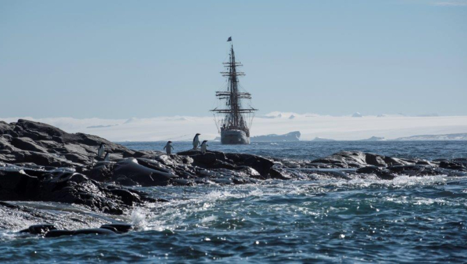 After spending the night motoring on calm seas, just rolling a bit on the long swell, in the early morning we were already reaching the isolated small archipelago of Danger Islands. The sight of countless tabular icebergs all around and the rocky outcrops of the islands under blue skies and sunshine brought a boost of energy and expectation to all of us. The next days, we will try to visit some of the most amazing spots in the area between the Northern Weddell Sea and the South Shetland Islands. And for starters, what could be better than the seldom visited, and usually inaccessible, Danger Islands. Out of several attempts the Bark Europa has done in the past, it has proved impossible to even reach close to the islands. So far, the area always had payed tribute to its reputation of being notoriously difficult to enter, due to the large amount of pack ice and the always considerable number of tabular icebergs around its shallow waters very close to shore. Surprisingly this morning we were welcomed by open waters, good weather and the ever-present tabular icebergs just played a fantastic role of offering a great background for our pictures, without representing a hazard for navigation. Danger Islands is a chain of eight islands trending NE to SW, on the Eastern coast of Joinville Island, just at the NW mouth of the vast expense of the Weddell Sea. Their name was given by James Clark Ross on 28 December 1842. He approached one of the biggest islands in the archipelago, actually without noticing it, as they are all surrounded by deep waters that suddenly rise above sea water, in some occasions as dome shaped islets, others as menacing cliffs. Ross got as close as three ships lengths from the so named Darwin Island, sailing amongst bergs and fog, when he reported that “the cliffs of the island, through the fog, appeared so perpendicular as to admit the ship going alongside, and well it was that they were seen in time to avoid running against them, as we had no suspicion of being near land”. He had been sounding every 15 minutes without finding bottom. Very different indeed from today’s conditions with a far reaching visibility of over 30nm. The seemingly desolate islands are worth a closer look that reveals countless penguins inhabiting its slopes. As a matter of fact, nowadays the rookeries covering all the islands are considered the largest Adélie penguin colony of the NE Antarctic peninsula-North of the Weddell Sea, after the head count produced last year, when Danger Islands jumped to the mass media due to this fact. The area has been identified as an Important Bird Area (IBA) by BirdLife International because it supports about 300,000 nests. Other birds that breed in the group include Gentoo penguins, Snowy sheathbills, Giant petrels, Skuas, Wilson storm petrels, Kelp gulls and Antarctic shags, all seen during the day, whether during the landing in the morning or zodiac cruising in the afternoon. Soon after breakfast, our guides were ready for a good scout of the shores of Heroina Island, that together with Darwin and Beagle represent the largest islets of the group, and the one that seems most accessible for a landfall. On its Northwest corner it shows a narrow inlet where after a struggle with packed drift ice, used by numerous snoozing Weddell seals, land could be easily reached for a landing. There is not much free space on land to move around, as every single square meter of the island seems to be occupied either by nesting Adélie penguins lying on their eggs, or their highways to go back and forth from their rookeries to the sea. A good look at the landing area, reveals the possibility for a short walk between the nesting groups, all carefully guided by Sarah, Nilla and Jordi. What a change from being at sea for a week enduring the rigorous Southern Ocean, to find ourselves walking on solid ground and literally surrounded by thousands upon thousands of penguins. After a couple of hours enjoying the incredible spectacle it was time to wrap up the morning and make our way to the landing spot, where we found the zodiacs struggling with the shallow waters on the rapidly falling tide. What was an easy boat ride two hours ago, now became a maze of rocks, little channels and grounded bergs, making for adventurous pick ups and rides back to ship, where we arrived right before lunch time. Sunshine and good weather helped for a bit of ship cruise after our meal. The towering rocks of Comb Island had attracted our attention during the morning. This castle like islet shows a different geological structure than the rest of the archipelago. All of it is made of basaltic rocks, but here they take a horizontal layered disposition, showing accumulation of layers upon layers of lava flows. After that it was time to head towards a smaller one of the Danger group, Platter island. A rugged island covered to the last inch with Adélie penguins, this was not a landing possibility so we launched our two zodiacs and sloopy to explore it and its inhabitants from the water. Not only was the island covered in penguins, the ocean was literally bursting of penguins swimming and jumping in synchronisation around us. A few hundred meters off the coast, we spotted small azure blue icebergs with black dots on them. A quick look in the tele lenses confirmed they were also covered in penguins. Shutters where going off as mad as many of us gave it our very best effort to create the iconic Antarctica image of penguins elegantly diving from the ice into the turquoise water. As waves crashed in along the shoreline, we spotted leopard seals hunting the Adélie penguins as they entered and exited the ocean. One penguin was caught by one of them and we all observed in awe and fascination as nature ran its course and the penguin became leopard seal dinner. Hidden away on a rocky cliff at the other side of the island, we observed several Antarctic cormorants. With beautiful afternoon light and calm seas, Platter Islan
