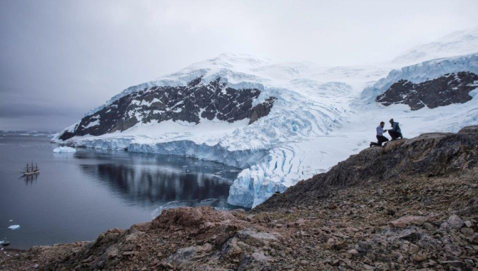 Many also enjoyed the hike to the vantage point with views over the whole bay, with a large Glacier at our feet…The perfect spot for a new marriage proposal from our voyage crew Benn to his girlfriend, and now fiancée, Daina. After spending a while enjoying the scenery and having a quiet few minutes listening to Antarctica, we all climb down the hill, leaving behind the couple to have a bit of intimacy. A nervous Benn, who has been waiting for this during the whole trip and is now wearing a shirt and a tie, goes on his knees and a second later the moment is sealed with a kiss and the magic word “yes”. Congratulations to the couple!