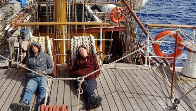 A ship's lookout is required by maritime law, not just for the simple amusement of the permanent crew as popularly thought.Lookout is performed with a buddy. The primary purpose as a lookout is to make sure your lookout buddy doesn't go overboard whilst peeing from the side.Be sure to arrive to relieve the lookout a few minutes early, before your buddy, not for any courtesy, but to get your preferred side of the ship. Ideally where the sun's warmth shines and a rogue wet wave is less likely.The hard wooden seats first appear to be the logical place to park your bottom however there are better options. The large coiled anchor ropes in the centre of the deck offer a soft padding for your butt or back. Sitting atop is an attractive choice, just beware not to suddenly fall backwards. Even better is to sit on the deck and slouch back into the pillowy fibers. You won't be able to see the horizon all the time this low, so feel free to close your eyes now and then. If anyone questions this, explain to them you are merely training your night vision - even during the day.It is a splendid opportunity to multi-task; sunbake, listen to music, discuss food fantasies, stretch, watch other people work and avoid the nuisance of sailing handling.In Antarctica, it is also an opportunity to freeze to death. Wear extra layers, the foredeck is often the coldest part of the ship, you won't be moving much, and more layers means more pockets to hide tasty snacks.If the weather is foul, the lookout will be moved to the poop deck where you'll have a front row view to watch your crew mates get slugged by sudden monster waves as they scoot awkwardly across the main deck. Be sure to cheer wildly as they're sodden and drenched cold.Finally, definitely buzz the officer of the watch in the wheel house often. Radar is just voodoo and shouldn't be relied upon.