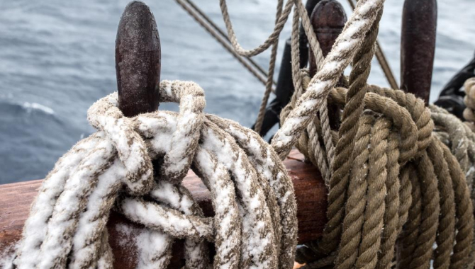 With the 30 to 35 knots of wind that we are experiencing we cannot set more canvas than Top sails & some staysails and we don’t get enough push to start heading NW. At the end it seems like the intervals between the showers are getting longer and the wind shows tendency to drop a bit, and Klaas decide to set the Courses to get more power, now that the wind has backed a bit. Even like this it is a hard job to set them, pulling tacks and sheets on a proper set. A couple of times the Courses have to be clued up and furled when the squalls strike. But during the night a seam on the Fore course rips and we have to take it away, replaced straight away by the permanent crew for a spare one. A challenging and strenuous job, that has to be done during the cold, windy and dark hours of the night. Fortunately late at night the wind becomes steadier on the Sw-ly quarter, decreases on the average force and we are able to set more canvas and start sailing again, now with a better NW-ly course, as the conditions gradually improve.