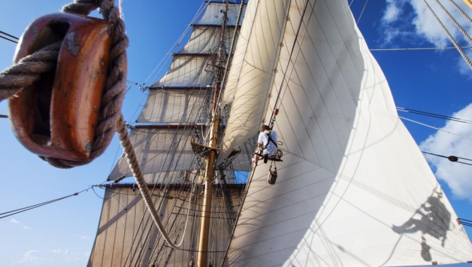 Today we sailed under a blue sky at a speed of 5-7 knots. After lunch Captain Klaas told us that in the next few hours we will sail into the neighborhood of the Abrolhos: an area of shallow waters that stretch along the Brazilian coast. It is a feared area by sailors because of its shallow draft and the risk of rocks just under the water surface. The captain decided to sail a slightly more easterly course .