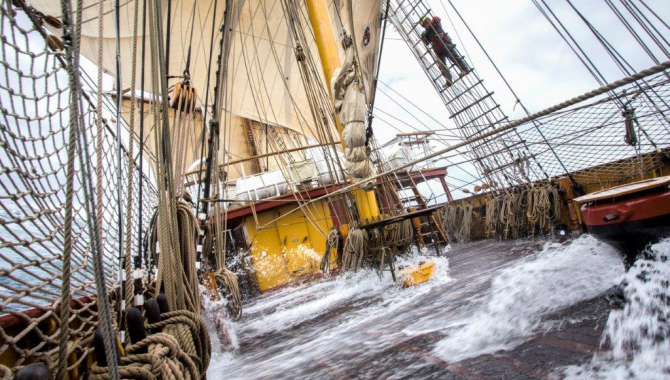 With the coming of the new day, the wind started to slowly decrease, but still countless small squalls sweep over our path to South Georgia, with their associated showers and forceful winds. Even so, the conditions allow to set more canvas, and the Main Course is clued down and adjusted. A bit later the wind blasts became more scarce and lighter, thus letting us set Fore Top Gallant and during the afternoon the Main one as well.