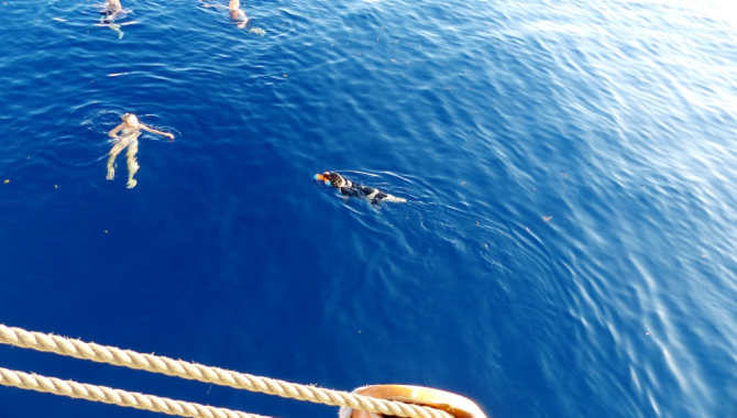 WeatherToday only six days at sea, but it feels like weeks. Since the start in Lunenburg we had already quite a few weather changes. Cold and windy, a shower at times and since we have reached the Gulfstream the temperatures have gone up from 16 to 29 degrees today. At first the wind was coming from the south, so we could make good progress to the east, doing 8 knots close hauled (the current gave us a hand), with the intention to pick up the right wind which will bring us to the south, but the whole weather system of the North Atlantic is confused, because of the hurricanes: Irma, Jose and Katia. They are really nasty, with pressures of 914mb (Irma) and 933mb (Jose). Irma with sustained winds of 130 knots has left some ruins behind her. So far we haven't recieved much information about what happened on shore in the Caribbean, but Irma has hurt St Maarten badly so we heard. We keep an eye on them, sometimes they stop and will continue on a complete different route. For us this morning the sea was like a mirror, nice time to go for a swim. The sun is hot and the water nice with a temperature of 26 degrees. Old and young were playing as if they were in the water for the first time. A nice break for things to come.
