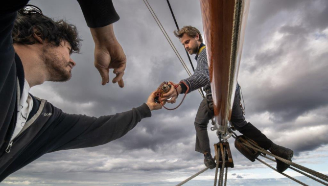 Also today, the crew took the opportunity to finish rigging the gear for the only sail we carry now that hasn’t been set yet, the Spanker. Its boom was brought on deck, repaired, and newly varnished during the shipyard period we just finished before the beginning of our voyage, and today it was time to finish the job and set it again.