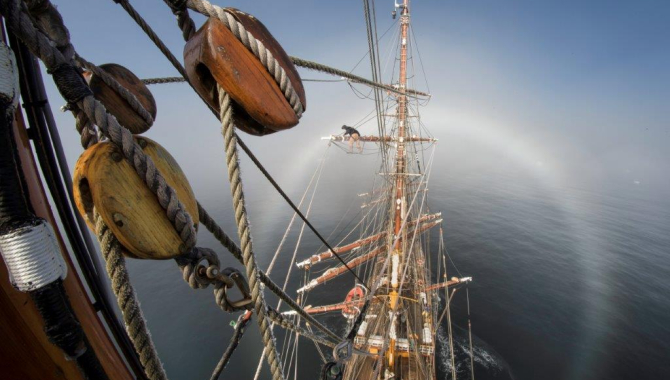 The good weather we had during last night turned into fog early this morning. At 06:00, as planned, but with very low visibility, we were ready to pass the narrow gap at Eclipse Point, sort of the bark Europa’s gate to the renowned Lemaire Channel. Impressive as it is, this narrow passage presents a navigational challenge even in good weather, so today our Mate Jelte faces it in the mist, squeezing the ship between the icebergs that leave barely any space to maneuver and glacier fronts at either side of the ship. Leaving behind the tight passage, it’s just about a half hour of open waters to the northern entrance of the coveted Lemaire Channel. From then on, the conditions indicate that at any moment the fog bank that hovers low on the waters of the scenic strait, can lift. And indeed, leaving the spectacular cliffs of Cape Renard at our port side, the high mountains of the surroundings start taking a peek through less dense fog. Gradually the situation improves, the fog gets thinner andthe glaciated and steep scenery starts to unfold for us to enjoy. Climbing the masts, a curios meteorological phenomenon can be seen. The layer of thin fog, together with the blue and sunny skies above produce a fog-bow. Similar to a rainbow but on that case the light gets refracted by the tiny droplets of fog vapor instead of raindrops. At the same time they also stick to the ropes and cables of the rig leaving a layer of little icicles on them. Suddenly, half way on the Lemaire we find ourselves in the sun with blue sky above our heads. On the horizon, all around us, still the lower areas of the Lemaire still remain under the foggy sheet. Europa takes her time on that sunny spot, cruising amongst the icebergs and brash ice of Deloncle Bay, a side cove of the main channel. After a while we resume our way south, gradually steaming into the fog once more. As we entered the fog again, the fog bow appears again and it could be seen by many from deck and more clearly from aloft.Luckily the ice conditions are pretty good inside the Lemaire Channel, and we keep motoring amongst icy patches and scattered icebergs between its high and glaciated mountains that shoot up to 900 m on either side of the ship.As we approach the small archipelago of the Argentine islands, we found several huge icebergs stuck amongst the numerous shallows and rocks, some of them dwarfing the old lady Europa that tries to squeeze between tight waterways on her way to a suitable anchorage, steered masterfully by our captain and mate. Exiting moments for all of us on this last bit of today’s route. Plans for the afternoon are to visit a couple of islets of the Argentine Islands group, including a stop on the Ukrainian Station Vernadsky. This group of islands is separated from the Graham Coast by Penola Strait and include Fanfare, Irizar, Uruguay, Forge, Grotto, Corner, Galindez, Winter, Shelter, Skua, Leopard, Black islands and The Barchans islands, between many small rocks and islets. The whole area was roughlycharted by the French Antarctic Expedition 1903-05 and named after the Republic of Argentina.