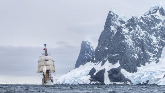 Expecting N-ly winds for tomorrow, in evening Europa steamed through the Lemaire Channel from our southernmost position of the trip in Collins Bay. When it is getting dark, the captain finds a precarious anchorage in a shallow plateau around Hazard Rock among the Puzzle Islands. Located in the Butler Passage, they offer excellent views over the entrance of the Lemaire Channel and represent a great departure point to sail again this picturesque passageway. As forecasted the wind has shifted and now blows towards the South giving us the chance to start setting sail and try a Southbound crossing of the Lemaire. Despite the cloudy morning, this time the visibility is good and during the morning keeps increasing and even the sun ends up shining over the mountainsaround the narrow waterway. Soon a zodiac is ready to take us touring around the ship under sail in this amazing setting. Lemaire is about 7 mi in length and averaging about 1 mi wide, extending in a NE-SW direction from Splitwind Island and False Cape Renard to Roullin Point and Cape Cloos. Sailing South, it separates Booth Island at our Starboardside from the W coast of Graham Land. Narrow as it is and usually filled up with ice, even though it was discovered by a German expedition under Dallmann in 1873-74, it was not traversed till December 1898 by the Belgium Antarctic Expeditionunder Gerlache. Curiously enough, he named it for Charles Lemaire, Belgian explorer of the Congo. Right after heaving anchor about 07:00h we gather on deck to start setting some canvas.Topsails, Top Gallants, Lower and middle Staysails, Spanker, Fore Top Mast Staysail and Inner jib are hoisted, while one of our zodiacs is launched. During the whole morning we will use it as a platform to follow the ship and take shifts photographing her sailing through the Lemaire Channel. Facing variable winds, weather and sea conditions, we all have the chance to take a tour around the Europa on this spectacular scenery, as she faces the icy waters of the passage. On some occasions the 15kn of NE-ly winds forecasted funnel into the channel reaching speeds over 30kn, making it difficult for the small boat to catch up with the ship as she happily sails steered by our captain. He also faces difficulties to lower the speed and turn around waiting for the zodiac to come alongside and change photographer groups. On other times the wind decreases just to pick up again afterwards. While some of us enjoy the ride on the rubber boat, the others are busy on deck following his sailhandling instructions. Sailing and photographing the old lady Europa along the impressive Lemaire Channel and its ice filled waters we spend a great morning. It is not always possible to sail in those treacherous Antarctic waters, and today we could even do it along one of its most famous passages in amazing light conditions and sometimes adventurous zodiac rides. However, the wind direction just allowed to sail southwards, when actually our next destination is located North of us. It is also time to start our way back, just another day left of our Antarctic program.