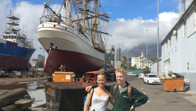 Enkele dagen voor het Nederlandse Tall Ship de bark EUROPA vertrekt zijn Lotte Linthorst en Matthijs Boesten gearriveerd in Kaapstad. Op de foto de beide jongeren voor de EUROPA op de werf, waar ze mee hebben geholpen aan diverse onderhoudsklussen. Lotte wist zelfs iemand uit haar hostel in Kaapstad zo enthousiast te maken over het schip dat hij meteen een dag mee kwam helpen. Beiden laten ons vanuit Zuid-Afrika weten dat ze er veel zin in hebben in de oversteek.