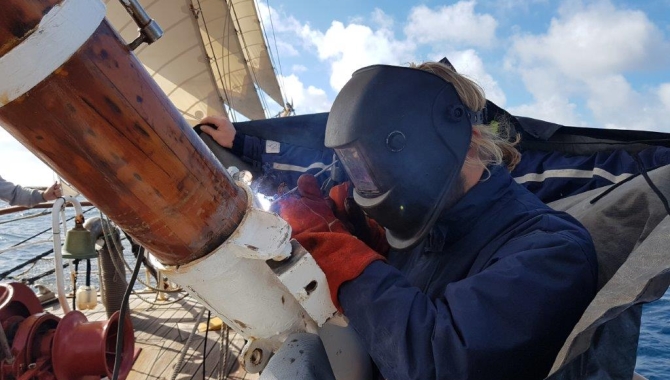 Surprisingly, even the logistics miracle that is Amazon Prime could struggle with next day delivery to “Europa, somewhere in the South Atlantic Ocean”. So the decks and forepeak are full of goodies – rope, twine, wire, spars, wood, canvas, shackles, glue, epoxy, etc. so that even if the relevant part isn’t onboard there is still enough in the way of raw materials to make something serviceable as an alternative. Yesterday the South Atlantic toyed with the Europa. There was a good breeze in the morning, slowly dropping to encourage us to set all the sails before lashing out with a fifty-knot plus sucker punch. Welds on the Fore Course Yard broke, the Main Upper Topsail ripped, lazy eyes were pulled out from the Fore Course (I think that is the technical term – they are the rope thingies which go through the sail to guide other thingy-ropes), and a fun time was had by all. To quieten things down a little, Eric the Implacable decided to let us drift for a while (apparently his preferred methods of heaving-to uses the Topsails, and they’d been successfully taken out of operation on both masts so he was on to about plan C).