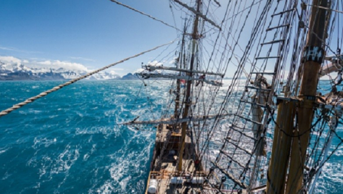 First Lower Topsails power our way to the open sea, where the coastal wind force decrease. Uppers and Top Gallants are clewed down then together with lower staysails. It was not until the night when the ship caught the offshore winds and could adjust her rig for a good sailing. Top Gallants come down and are furled, expecting a sudden increase of wind later on. Instead, a gradual rise in its force makes for setting the Courses, bracing sharp on Starboard tack and start our way, leaving the island behind. Several Humpback whales blow close to the ship while the sunset lights the island’s mountains. A great farewell to South Georgia and a welcome to one of the roughest seas in the world.