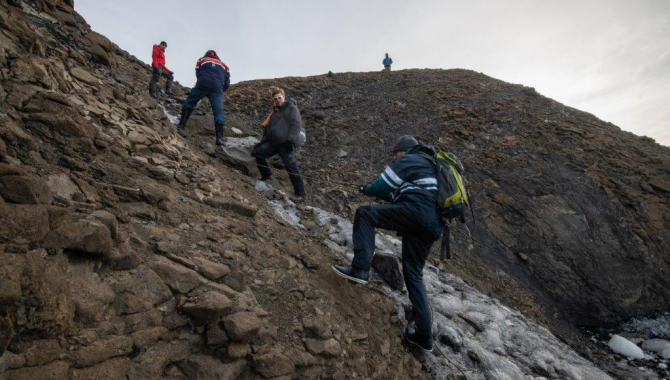 A landing site was decided upon and it was time to don our layers and life jackets ready for exploring the terrain ashore. From the shoreline nearest the ship, we made our way up to a saddle amongst hills. The wind began to increase slightly as we made our way up the slope to a high point marked by a mushroom shaped rock where the base had been eroded by the strong winds. As soon as we made it up to the ridgeline the wind blew strongly in our faces, coming from the northwest off the glaciers that sprawl across the Antarctic Peninsula. Northerly winds had been forecast however, it seemed although the strength was exaggerated by the katabatic effect, where the cool dense air flows down with great speed from the higher glaciated ground.