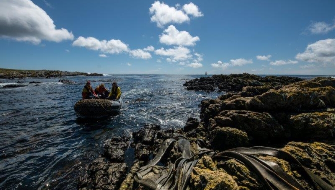 Once at the northern side of Steeple, we were still needing some time to reach the place where it looked like there might be a chance to find a corner between rocks were to land. Crew and guides were not very optimistic to start with as quite large swell was sweeping all the rocky shoreline. But nevertheless a zodiac was launched to scout the area. It took a while for our guides to make the decision of going ahead with the landing operations. Tugged between rocks and guarded by a Kelp forest bed, a relatively shelter place was found. But we are not the only ones that liked this little hideout, many inquisitive Caracaras check everything and everybody that lands, while a handful of Sea lions were already basking in the sun there, but after a short parliament with them they agreed to remain calm and allow for a landfall