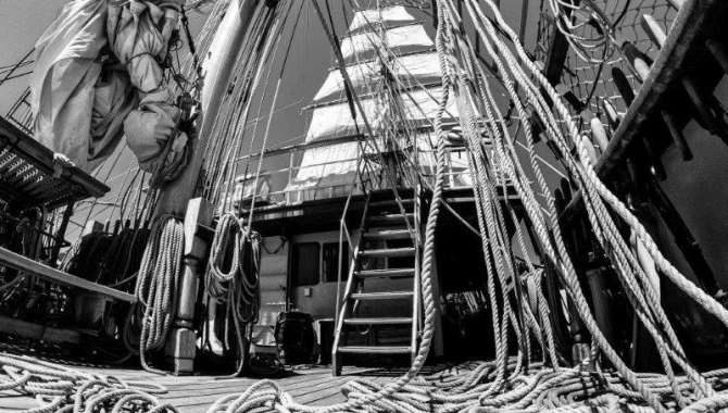 After a calm starry night, dawn met us motor-sailing with just a few staysails set. After a quite chilly night, the rise in temperature at sunrise was greatly welcomed by the crew steering and at lookouts. Virtually a windless and warm morning followed, while the Europa keeps her way under engine over calm seas. On those conditions there is not much birdlife around. After yesterday’s winds that they used to soar over the swells, today they rest sitting on the water awaiting for fair breeze that would allow them to glide again. But things were about to change soon. After morning coffee time the scheduled repetition lecture on penguins had to be postponed until further notice as the wind had slightly increased to about 12kn and veered now blowing from the North. All hands available gathered on deck to brace square, unfurl and set all the square sails, after taking away the staysails, leaving just the Fore Top Mast Staysail in the bow sprit and Spanker plus Gaff Top sail in the Mizzen. Sailhandling make us to gradually get used to the seemingly spider-net of hundreds of ropes surrounding us, and they start to make sense after listening daily to the crew instructing about their functions. Setting or taking away sail in the Europa is always accompanied by explanations and training, to help surface the sailor spirit hidden in many of us.