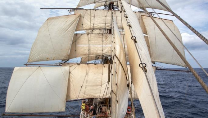 After wearing the ship and setting all our canvas but the Studdingsails on a 190º course, we could not hear the noise of the engine anymore. At lunchtime Permanent together with Voyage crew help setting the three Studdingsails on Starboard of the Fore Mast, while our Captain takes the wheel. Afterwards it became quite busy on deck, as we wear the ship twice and when we got a more stable wind and course, rigging and setting Studdingsails on both Port and Starboard sides of the Fore Mast, sailing downwind on a 230º course. Several movements had to be done with our Staysails and head rig as well, as when sailing downwind they get shadowed by the squares taking the wind.