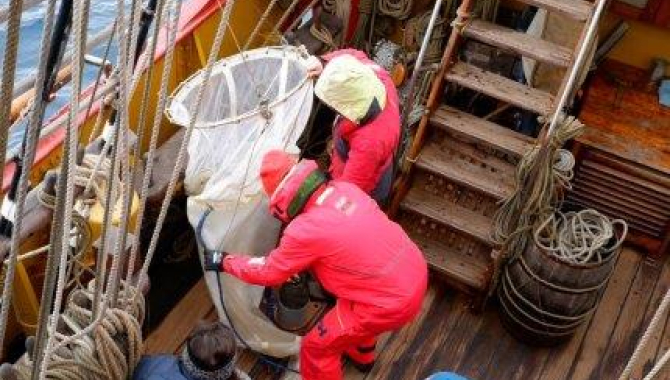 The net was lowered over the port side using a line rigged from the fore course yard. The downward pointing cone shaped net was then lowered to 50 metres depth. Once it reached 50m the net was pulled vertically upwards through the water column to the surface using the anchor winch. Gen, from the Scouts, donned the obligatory lab coat and safety glasses for the final stages which involved the processing of the catch and recording of the details in a log. The findings are currently being studied under the microscope.