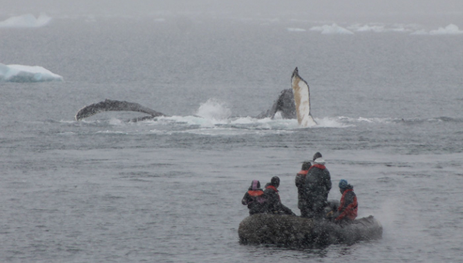 by Cristina VintilaThursday, January 25th, we started off in Neko Harbor of the Andvord Bay, with a lovely morning landing off the side of a calving glacier. We hiked a bit on the hill next to the glacier, slid down like on the ice like kids and enjoyed taking photos of the local Gentoo population.Why do I say a Perfect Day? Well, because so far it has been packed with highlights: first continental landing on THE Antarctica!!, breathtaking sight of the slowly calving glacier (took loads of amazing photos), enjoyed so much spying on the cute goofy Gentoo penguins walking wobbly along their highways, in a rush to get to the water, and to their chicks – respectively, and had quite a bit of quiet time for meditation on the beach next to the glacier. Our awesome guide Sarah made us aware of keeping an eye on the calving, as to expect a wave within 40-60seconds, and not get an unplanned “Antarctic dip”.The day started great and it continued Better! Off we are towards the Paradise Bay for our afternoon zodiac cruise, planning to admire the awesome peaks of the Paradise Bay, only to discover thick mist – but fear not: whales had plans for us. For the approx. 6 hours in the Paradise Bay we were accompanied by at least 4-5 families of humpies (humpback whales), in pairs of 2, 3 and 4, curious swimming around the ship and around the zodiacs, feeding and putting on an amazing show! Long forgotten were my feeling of cold on this misty wet snowy days: I put on a grin and watched out for the amazing giants for at least 3h (2 on the deck and at least 1 more in the sloopje, chasing them around, to take photographs, videos and to also use the aquatic microphones to record their sounds). I can describe how awesome they are (some attempt – see photos of Brad), and that huge grin is still here on my face, 5h later :D :D :D.To close of the day, Sarah told us the story of the brave Norwegian crew of the ship “Antarctica”, who ended up spending 2 winters (1901-1903?) in 3 islands on the east coast of the Antarctic Peninsula, split in 3, lost of each other and trying to find each other, keeping their morale up and diligently doing research: their research seems to have set the basis for the theory (later confirmed) of the continental drift.To top it up, our awesome cook, Rensje, just made my favorite dish, lamb stew, for dinner, topped up with a nice fruit salad with cream and chocolate sauce on. Booyah!! Best. Day. Ever.!!Looking forward to tomorrow – Cheers, Cristina & Brad, January 25th, 2018