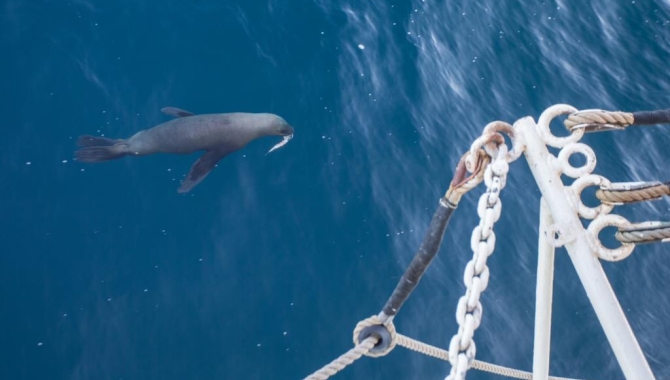 The most remarkable wildlife sight today was the visit of a South American sea-lion, she was hanging out around the ship after dinner for a while, showing her interest for Sirius (barking at her) the ship and her crew, checking the hull from every angle and looking at us with curiosity. She took the chance also to catch a fish, that probably got attracted by the Europa and her slow pace, looking for shelter, as many fish use to, aggregating around floating objects at open sea. The Patagonian coast, on either side in the Pacific or the Atlantic is home for big colonies of those seals, that now are arriving to the coasts and starting their breeding seasons.