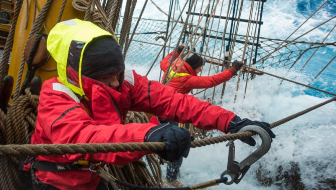 Stopping at South Georgia and entering the Scotia Sea, things got serious. The Voyage Crew began to resemble Michelin Men as we marvelled about just how many layers could fit under our waterproofs which were showing signs of actual use. The permanent crew began to wear beanies and Sarah even raised the hood of her jacket on two consecutive days. Their waterproof jackets appeared during night time watches. But most still did their rope handling without gloves, presumably to be more in tune with the feel of the boat. Perhaps the vibration in a halyard can be used to detect that a screw at the top of the mast is a little loose and needs someone to go up with a screw driver and tighten it by an eighth of a turn.