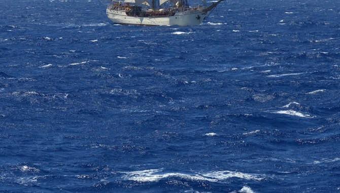 A huge thanks to Master Thilo Natke for forwarding these pictures.###Dear fellow ship mates,Please see two pictures by Silke vom Wege of our meeting in the South Atlantic on November 1st 2014 . It was an impressive sight to watch a beautiful ship under full sails.Wishing you and you crew a successful season down below,Fair windsThilo NatkeMaster MS “Hanseatic”