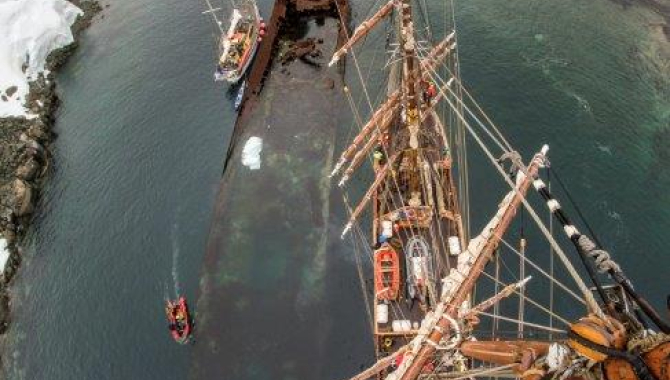 Cierva Cove offered a fantastic closure for yesterday. Sun set when we were amongst the brash ice and icebergs from recent calvings of the glaciers enclosing the cove. The deep waters and the large amount of drifting ice are not suitable circumstances to drop anchor, so we soon start our way southwards along the northern part of the Gerlache Strait. At midnight, getting closer to our destination for the day, engines stopped, and Europa quietly drifts for a few hours, timing our entrance to the Graham Passage for around 07:00h. Then it was time to venture into the scenic passage that separates Bluff Island from the W coast of Graham Land. Captain Skidsmo named it after his whale catcher Graham, which was the first to pass through it, on March 20, 1922. Even though it’s often clogged by ice, today we can make our way through without much difficulty. Luckily on this gloomy, cloudy and rainy morning just a few big icebergs are scattered around. Getting off the passage, still a couple of hours navigation are ahead, until reaching Enterprise Island where the whaling vessel “Gouvernøren” shipwrecked in 1915. There she lays, in a small inlet with her bow off the water and the rest of the hull submerged up to a depth of 20m. As we motor our way, we are surprised by a couple of Humpback whales spotted close to the ship. Skillful maneuvers lead to a great approach to the feeding animals, and soon we found ourselves turning the engines off and drifting to them. At that moment they seem to realize our presence, as they stop their feeding activity to come to the Europa for a close inspection. For a while they were swimming and diving right next to us, offering an unbelievable spectacle for all of us. Spy-hopping, showing their flukes and scrutinizing all the length of our hull they spent a good 20 minutes. Time enough for some of us to climb the rig and have a look at those magnificent animals from up the masts. Once sure it was just the old Bark Europa again sailing those waters, they resume their feeding, swimming away searching for the nutritious Krill, the base of their Antarctic diet. In a few more days the Humpback whales, now feeding in Antarctica, will start their annual migration North towards their breeding grounds. The individuals we see during this trip belong to what is known as the “G” population, breeding in the tropical waters of Colombia, Ecuador, Panama and Costa Rica, coming all the way to these high latitudes in the South for feeding. As they continue their activities, so do we, starting our engines again, heading towards the picturesque “Gouvernøren”, a sunken ship located in the little cove of the same name, indenting Enterprise Island. With its 1.5 miles in length, the island lays at the NE end of Nansen Island in Wilhelmina Bay. It was first charted by the Belgian Antarctic Expedition under Gerlache in 1898. The islands became well known to whalers operating in the area in the early 1900s. Enterprise Island takes its name commemorating the whaling enterprises in the area, that became a major center of summer industry during the period 1915-30, and the shipwreck lies there as a reminding witness of those times. Being a whale catcher/factory ship and loaded as she was with 16,000 barrels of whale oil, it was not possible to extinguish the fire that finally doomed her. Actually, the Captain got time enough to intentionally ground the ship in the little cove, saving his crew and part of the cargo, that were picked up by other vessels.
