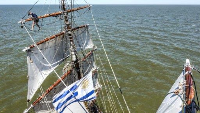 A sunny morning under clear skies and a fair breeze welcomed us to our departure day. Before departure, a mandatory safety talk and instructions must be conducted. While we were still alongside and with all gathered on the main deck, several crew members climbed aloft and started to unfurl top sails, head rig, lower and middle staysails. The rest of the crew was still busy with the last preparations before setting sail. By then the Uruguayan harbour Pilot was already on board, while the Europa off-signing crew helped to let go our lines, waving goodbye and cheering best wishes to each other. It didn’t take long for the pilot escort the ship out of Montevideo Port and be picked up. Right after this manoeuvre, the voyage crew could give a hand with setting the sails that were already unfurled. The W-ly wind of about 19kn made for postponing the planned familiarisations and instructions for the guests, in favour of starting the trip with great sailing. Like this, taking advantage of the good strong breeze, during the morning gradually almost all our canvas was set. Adding our jibs, top gallants, courses, royals and spanker to the sail configuration, Europa unfolds almost all her wings, happily sailing at over 6.5kn on a S-ly course over the murky shallow waters of Rio de la Plata estuary. Over our heads fly the European and the Uruguayan flags, and high up in the foremast flies captain’s Eric red flag, number 45. Many a voyage crew member looked quite overwhelmed by the amount of sails and ropes to learn and pull during the next days, nevertheless comforted by the permanent crew as they explain that it takes a bit of time and dedication to get used to it and gain an understanding of how our beloved ship works. Hopefully the experience we will graduallyattain during this trip will bring up to surface the sailor spirit hidden inside many.Many things had to be done still during the day, like getting us familiarised with our duties on board along the whole journey. With full sails over our heads, we gather on the main deck and are divided in a couple of groups each led by a crew member, who briefed us on how to steer the ship, some emergency procedures and how to conduct a proper look-out. With those activities we opened the door for the start of our watch system, which will continue until reaching the wild coasts of South Georgia Island, about 1600nm away from us. During the afternoon, as we step into our watches, the wind eases to about 10kn, backing from WNW-ly to more W-ly and the good speed we carried earlier also drops to about 3kn on our southbound course. But the general forecast is to have headwinds soon, and indeed we didn’t have to wait much longer to find ourselves under stronger S-ly winds, blowing over 25kn. Time to change course and head now in an E-ly direction while with the help of many, all square sails are clewed up, together with taking down and furling upper staysails and outer jib. Our new course will allow us to motorsail during the next hours with the help of the spanker and lower and middle staysails. All those operations allowed for a good sail training afternoon for all voyage-crew, and to complete the day, climbing instructions for the ones still around were done. After this we start feeling more confident on board and many already think on going aloft and give a hand to the permanent crew furling, unfurling and preparing sails. The confused sea state and variable winds we are experiencing are related to an atmospheric compression zone located above our heads, as we find ourselves right between a low pressure system and a high pressure system (the centre of which will cross our path during tomorrow) that follows it. According to this, the forecast for the next hours indicate lighter winds until tomorrow in the late afternoon, when a fair breeze will help us sail on our way to South Georgia. As the hours pass by and night time arrives, the sea conditions seem to worsen and the seasickness starts to strike. Quite normal and understandable on our first day at sea. But we can never be sure if those affected were the ones who followed our Doctor Hans instructions on how to really experience the unforgettable event of seasickness. Between jokes his recommendations were to don’t eat anything, get drunk the night before sailing off to the sea, forget about breakfast and substitute it by a full packet of cigarettes, drink lots of non-sugary coffee and spend time where the ship pitches and rolls the most, in the fore deck or in the aft, looking sideways to the seas.