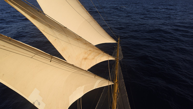 As always, reaching the open ocean, seasickness hits hard for those who have not been at sea for a while. Buckets are carried out from the deckhouse, conveniently cleaned in the scuppers as the waves are splashing over deck. Panic inside arises when the buckets all seem to be stuck together, impossible to separate and in this way only providing security for one person. Yes, the night is a little rough, but during the day the movement calms down. Instead of using alarm clocks, which will definitely wake up all our cabin mates, we have the habit of waking up each other. This morning our cook Rensje woke up the Port watch with the following words: 'Matthew, Sarah, Good morning! It is beautiful weather, it is a Paradise Drake!’. And it is true, to be able to cross the Drake like this is Paradise, especially for the crew that just last week was still heading against the wind for 5 days in a row, on the same stretch of ocean. We are lucky this time. Calm weather also means that more people are able to attend the watches. During the morning we have an introduction to square sails by Adam in the deckhouse. After we set the remaining sails – with the upper staysails and the gaff topsail up we are now under full sail. After everything has been set and all the lines are back in place, Sarah gives a lecture about seabirds down in the lounge. As we are chatting a bit after the lecture, we suddenly spot something unexpected. Through the porthole we see a small sailing vessel passing by! Well, we see a set of sails passing by; the hull is almost invisible behind the waves. It is the Maltese flagged Rusarc Aurora – a boat that sailed around the world against the wind twice. We overtook her last night, being faster in stronger winds, she is overtaking us now, sailing faster in lighter winds. After lunch the lecture on Square sails is repeated for the other watch and later in the afternoon Belèn tells us about whale sightings and how we can record data on our voyage. Bark Europa visits similar areas in the far South each year, covering large distances, and we can make a contribution to science by noting down and reporting our sightings of whales and dolphins. At our 8 0´clocky Eric points at an empty spot on the chart, and reveals we have covered 177 miles since yesterday. With an average speed of more than 7.5 knots we are doing well. Our heading and our course over ground are now almost the same – we are no longer pushed eastwards by the strong current. The depth is about 3700 m, water temperatures still quite warm at around 5-6 degrees. We are almost halfway to the next bit of land, 303 miles to go.