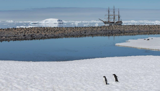 Europa was skillfully steered between sheets of pack ice , icebergs and some large tabular icebergs towering above our masts, until reaching our anchorage on the North-east coast of Paulet. This perfectly pyramid shaped volcano is circular built with a diameter of 1.5 km. Dwarfed by the larger Joinville, Dundee and Durville Islands, rivals them with its beauty and distinguished character.