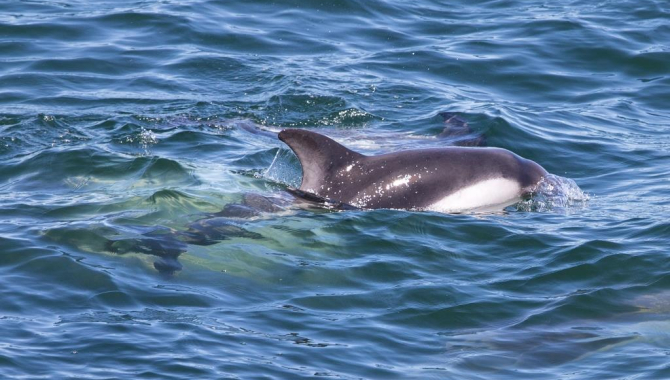 And while we almost sit in still the water, sailing at just 2 knots of speed during the morning and part of the afternoon, we keep having Patagonian visitors. First a group of Commerson’s dolphins pass by checking us, later on several small groups of Peale’s dolphins swim around, curious about the ship. After hanging around for a couple of hours, waiting for us to catch speed and have fun bowriding the Europa, they seem to realise that will not happen, at least, not for the moment, and they leave us and probably search for some for fish elsewhere. While the dolphins are around, groups of Sea lions approach us as well. Females form those groups, and no big bulls are sighted. Besides being more solitary animals, by that time of the year the males are mostly on land defending their territories and harems from the other mails. So what we can see around are females on their way ashore or foraging.