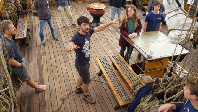 Plastics and circular economy are also on the on-board menu. I kicked off with a quiz. Sixteen questions about plastic pollution, like What is the most found plastic item on beach cleanups worldwide? and What plastic items are targeted by the European Single-Use-Plastic Directive? We organized the quiz twice because of the different watch hours. Eric (the father of cook’s assistant Sara) and Elza both won an edition, receiving a Bark EUROPA branded reusable water bottle (a Dopper) and a Bark EUROPA t-shirt. Later I gave a lecture about plastics, from the production of the base product (pre-production plastic pellets, or nurdles) to so-called end-of-life, when plastic becomes waste and is recycled, incinerated or dumped in landfills or when it becomes litter (plastic pollution). I also compared plastic to natural materials. In short, I guess the take-away message would be: plastic is not bad in itself. It has brought us a lot of comfort, safety, possibilities and progress. Looking at the overall impact, plastic scores better than some natural materials, which for example are a lot heavier (glass) causing higher transport emissions or require more water, land and pesticides (cotton). Plastic is an environmental problem though when it ends up in our environment where it might never completely degrade anymore. We might be talking hundreds of billions of kilos. All plastics breakdown into micro- and nanoplastics. Also chemicals could be problematic. Of the 10000 chemicals associated with plastics, up to 2400 are potentially harmful to humans. Finally, being a very cheap material plastic does not incentivize to switch from our throwaway, single-use culture to one of reduction and reusables. With that mind, voyage crew will make lists of ideas to reduce their plastic pollution / ecological footprint, which we will discuss at the end of the voyage.