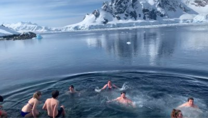 Then through the beautiful Wilhelmina channel full of icebergs and stunning views. We arrived at Orne Harbour and not only did we walk on mainland Antarctica for the first time, we also did our first polar plunge!!! None of us lasted more than a minute but we did all plunge … no paddling for any of us (air temp was 2.5 and water temp 0.1degC). Then to warm up we climbed up 100 meters to see some Chinstrap penguins.