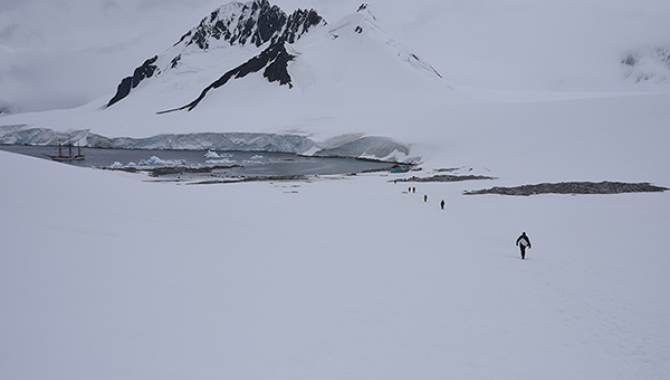 After our visit to Port Lockroy we are all back on board just in time for lunch. Instead of leaving straight away we stay at anchor for a bit – talking through the further plans for our voyage. At two o´clock we hear the bells and both Eric and Sarah appear in the deckhouse. This surely means something has to be told. It does. An impressive low pressure system is on its way, and while we were on shore Eric has made the decision that we will leave for the north already this evening. We had still one landing planned, but in this way we gain about 18 hours, which will probably be the difference between being able to sail at least partly, or heading against the wind for the full 645 miles.After lunch we start heaving our accidentally dropped 4 shackles of anchor chain – and move a few miles for our afternoon landing. We will land in Dorian Bay, starting with a short hike to Damoy point. The weather is good, there is not as much wind on this side of the glacier, and the sun is almost shining. The hill at Damoy Point is is only 49 meters high, but the views are impressive. Down at sea-level we can see and even hear a Minke whale passing by.From the hill we walk back down – to visit Damoy Hut. It was built in 1975 by the Antarctic Survey, to house staff involved with the planes that used to land on the glacier. The glacier was a transit stop on the way to Rothera station further South. The hut is practical and straight forward. A bright turquoise building with a combined living room and kitchen and a sleeping room with 10 bunks. On a day like this it is easy to imagine living here. Next to the British hut is an Argentine emergency shelter. Behind the hut we can climb up to the glacier where the airplanes used to land. It is a steep but short climb, bringing us to a point with splendid views down to Port Lockroy on one side and Europa anchored in Dorian Bay on the other side. The snow has the perfect consistence to fall into and lay down in – and off course, for a last Antarctic snowball fight. And not only that – it also turns out to be the perfect place for Seth to ask Michelle to marry him.We heave anchor during dinner, and sail slowly out of the bay. We are not using sails, only the rigging, until the dishes are done and we can go out into wilder waters. We set sails except for the royals, the upper and middle staysails and the gaff topsail – and start sailing north with good speed and nice winds. We have 645 miles in front of us – all the way to Cape Horn. We start off to the North West, which will hopefully later give us a chance to sail on the strong northwesterly winds that are predicted closer to Cape Horn. As we leave Antarctica behind us, we all go straight back into sea watches.