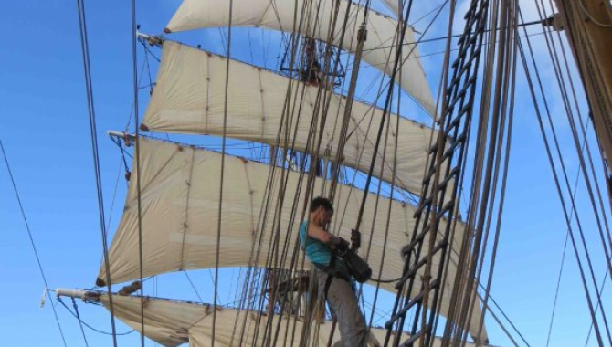 From the first platform of the foremast, with the afternoon sun playing between the sails, I could hear my fellow shipmates singing old sailor songs from all countries, down below, in the deckhouse, the indistinct sound of conversations, on the foredeck, and the whispers of the waves against the hull, a sound that has become so familiar, over the last 3 weeks, that it seems to be part of the air itself. When I looked up from my task, for a moment, all I could see were the white square sails and the impressive stunning sails of the foremast, and all around, in every direction, the deep blue of the ocean.