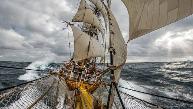 It didn’t take long for the forecasted strong Southerly winds to start blowing already during the night, shifting to Southeasterly in the early morning. With the blows up and down from 25 to 35kn, it's time to pull down and furl the powerful Outer Jib. Backing winds made too for bracing sharp on Starboard tack and sheet-in the staysails.