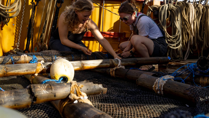 With confidence in our methods, we head into our next sampling station of the trip, deploying our surface-trawling net over the side, checking that the concurrent moving parts are all functioning as normal, and contently observeas everything is going according to schedule. “Helen, plastic!”, someone calls from the port side (with 43 souls on board, no plastic that has floated past our ship during daylight hours has gone unnoticed). I head to the opposite side of the deck, to peer at what I expect to be a buoy, a bucket lid, or some other typical debris item that is large enough to spot from the ship. Instead, we see three boobies, perched on …something? – it’s unclear. A surprise. We grab the binoculars. It’s certainly debris, but we’re too far away, so we start to maneuver a little closer to check it out. Curiosity gets the better of us, and we interrupt our trawling in order to get a closer look at what appears to be a large raft, with buoys and bamboo giving the material its structure. One by one, the boobies decide to flee their temporary resting raft, taking flight with little more than a few bounds along the water surface. We sidle up to the raft. At 1.8 x 2m long and wide, its retrieval requires quite some attention and mechanical advantage. Luckily, much of the ship's company has arrived on deck at this point, and the heavy lifting can be facilitated by employing blocks. Once the raft is on deck, the initial adrenaline of this change of pace wears off; we’re apprehensive about this foreign object arriving on our familiar turf. Then the well-trained routine kicks in – Marretje and I assemble crew members to help separate biological material from man-made material (just like with our net samples). We catalog the living organisms attached to the raft: pelagic crabs, gooseneck barnacles, and a brittle star, among others. Methodically and diligently, we work our way through processing this new object of interest, taking dimensions, subsamples of the netting for later polymer identification and weathering analysis, and searching for clues of origin on the buoys.