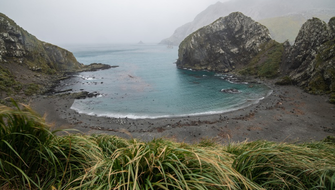 Four kilometres long and at its narrowest 300 meters wide bay, the Tussock grass blanket its slopes waving in the strong winds.