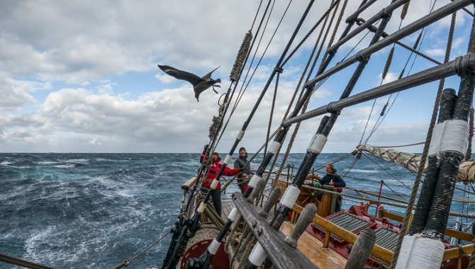 Still on decks that often dip in the water, permanent and the keen voyage crew that feels adventurous enough to let a hand, brace a bit squarer and set the Upper Topsails.