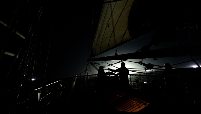 Good evening,POS: 53*44,9 S 037*54,2 WCOG: 108SOG: 1.2 ktsWND: NNW 5 bftSEA: 1 meterSWL: NW'ly 3 meterWater temp: 3Air temp: 4.6Rolling in the dark. That is what we're doing. Looking out of the wheelhouse windows I see nothing but the navigation lights. The decks are empty, all voyage crew is sleeping and only a few sails left. This afternoon we got close to South Georgia, but in a 30 knots blowing Northerly wind. To say that that wind is not such favorable to find shelter on the Northern shore of the island is an understatement.