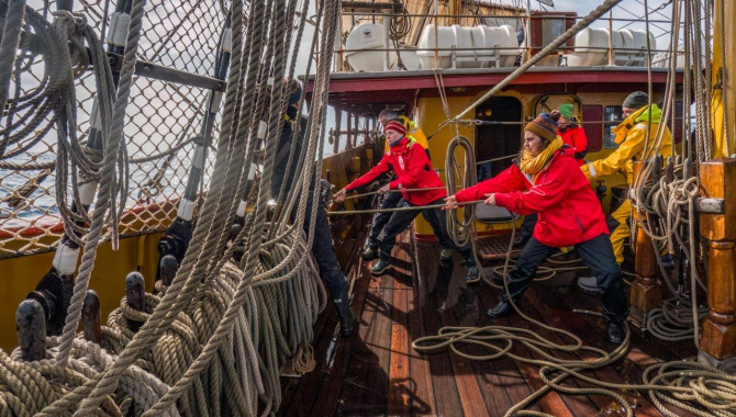Uncomfortable sailing until mid-morning when the winds back to a southerly. Time for pulling her braces to beam reach and setting canvas again. The wind shift comes too with a better motion and drier decks. Despite the light winds, decreasing during the day to about 12 knots, we have sailed in the South Georgia direction 153 nautical miles during the last 24 hours, as the Captain informs us at our regular meeting after dinner.