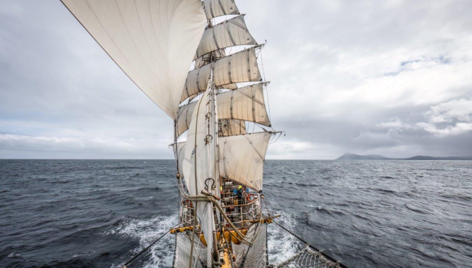 Smooth sailing overnight gave us a good view of the island during the morning. In front of Cape Horn, we sail in calm conditions that just pick up under the overcast sky and drizzle as we start leaving it behind. All squares are set, together with lower staysails, spanker, and our jibs, speeding up until again we slowly enter the shadow from the southern Patagonian lands. Then, for the rest of the day, Europa slows down once more. The fair wind becomes a breeze, then just light airs. Steering courses keep changing, as the light puffs of wind often come a bit from everywhere. Most of the sails come down, though not being furled, waiting for better conditions forecasted to come soon so they can be pulled up again. But it doesn’t happen until late at night when the northerly breeze turns to a better northwesterly, increases, and lets us set the canvas again.