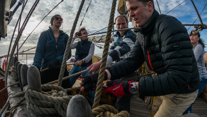 But veering light breeze in the afternoon made for their numbers to gradually start decreasing, as Europa’s braces are pulled squarer, goose wing the Main Course to allow some wind to pass and fill the Fore and Staysails are packed away.