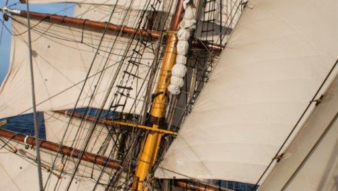 People on watch was called on deck and as usual were divided between the three masts as the Mate takes the helm. Once all is ready the voice is heard to ease the lee braces while the opposite ones are to be hau-led tight. Crew stands below the masts to trim and call each yard when is well. In the meantime Spanker and Gaff Top sail must be tacked and finally the Staysails as well. With almost all the canvas set the process takes a while, keeping busy the standby people on watch out of the deckhouse.