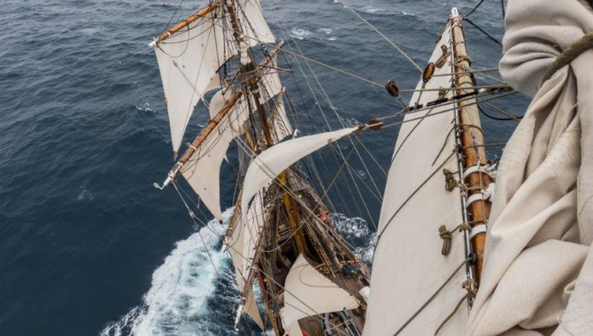 It was just in the morning with an increase in the wind to about 30kn when the Royals come down and are furled, just to be set before lunch in slightly decreasing winds. It didn’t take long, though, for the 30kn to come back, and hands are called again in the afternoon to strike them down once more.