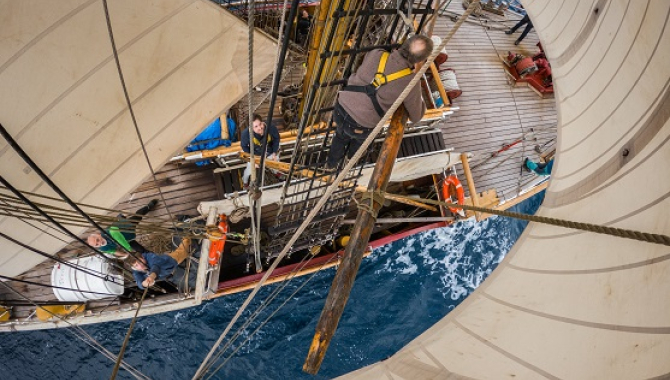 While many are up the rig or down at the Foredeck busy with hoisting those booms, the good weather and calm seas gave also a good window of opportunity to our engineers to start showing some of the areas downstairs that until this moment have been off-limits. Small groups of curious fellow travelers that are interested in knowing what happens down at the ship’s dungeons, are shown the engine room, dry stores, fore-peak switch room, and the like.