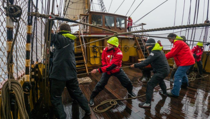Drizzle, rain, cold, the danger of the scattered icebergs, occasionally waves washing over the main deck. But we live just at scare handful of meters of a different world: the warm, dry and inviting below decks space.