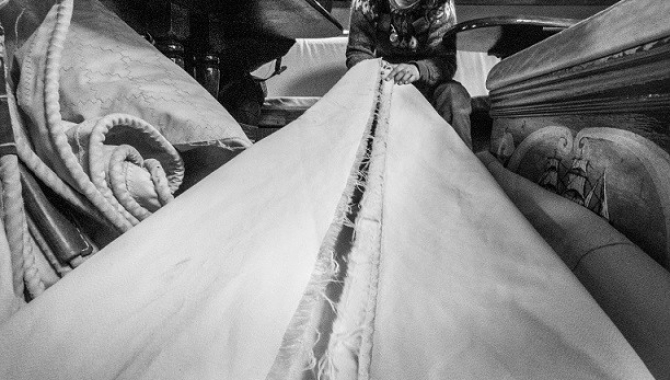 The rigours of sailing in the harsh conditions of the Scotia Sea have taken a toll on our sails. A few days ago the Fore Top Gallant gave up holding one of its seems and was replaced. Today, the Outer jib with a panel ripped had made its way too towards the aft of the ship, and now both are taken care of in the ship’s library. Assessing the damage, prepare the repair, get new canvas, stitch and saw, it all will take some time before they are ready to be bent-on again.