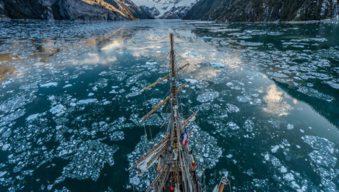 Last night, with a light breeze blowing into the fjord, the Europa set canvas and with the help of her engines too, made her way to the very end on the main sound. There we woke up this morning to a clear and sunny day.